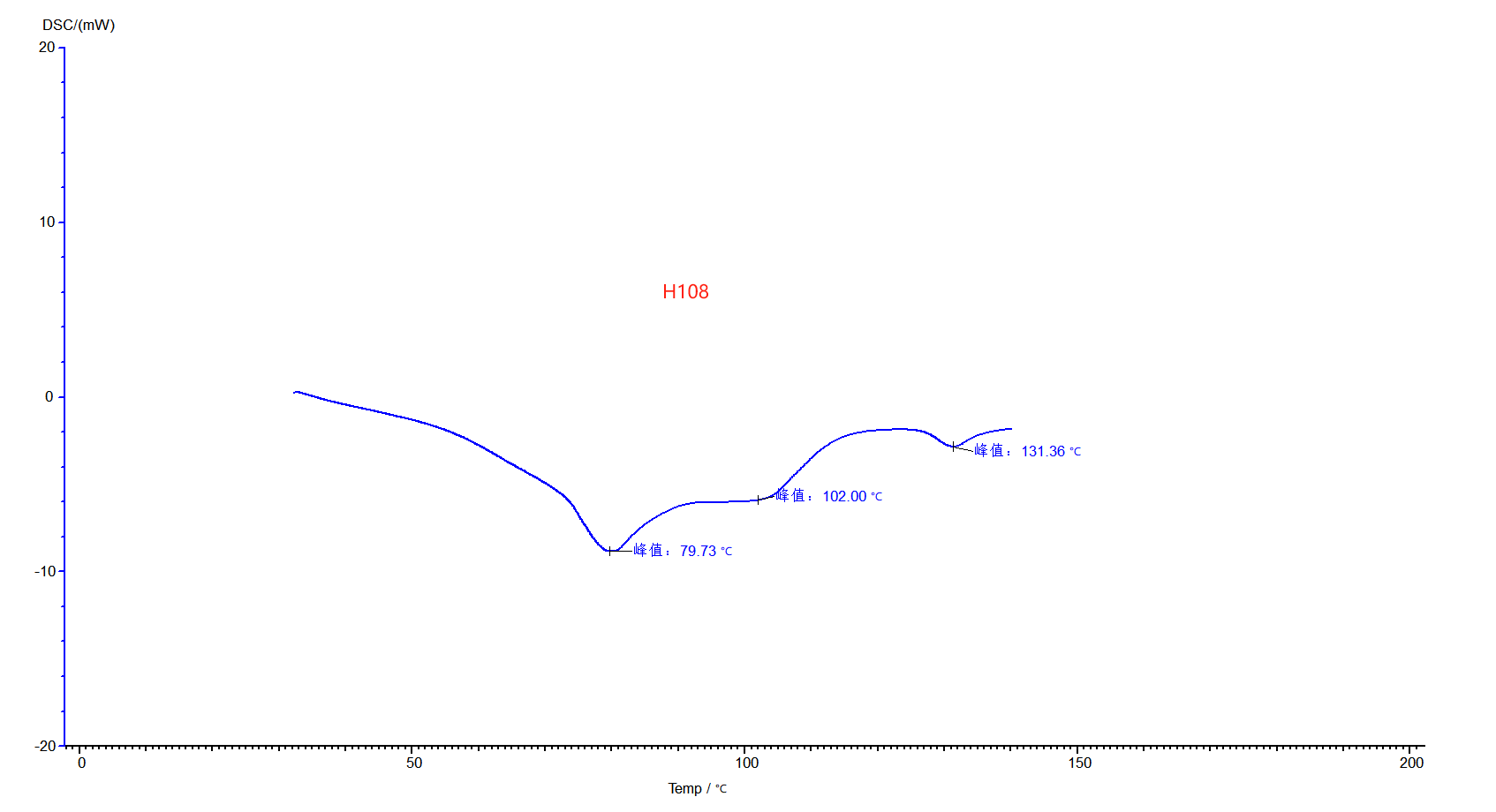 從DSC的測試結(jié)果顯示,樣品高端復(fù)合蠟H108的峰值溫度是79.73℃、102.00℃、131.36℃。