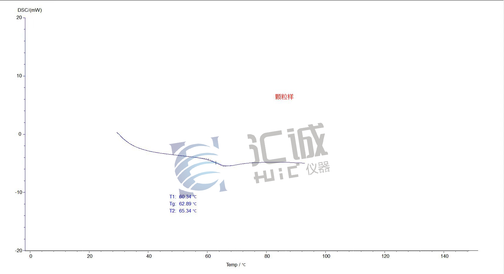 上圖是利用匯誠儀器DSC-600S對有機樹脂的實測圖譜,由此可以看出顆粒樣有機樹脂的玻璃化轉變溫度Tg值是62.89℃。