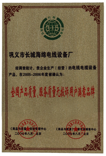 鞏義市長(zhǎng)城海綿電線設(shè)備廠在2005-2006年榮獲“全國(guó)產(chǎn)品質(zhì)量、服務(wù)質(zhì)量